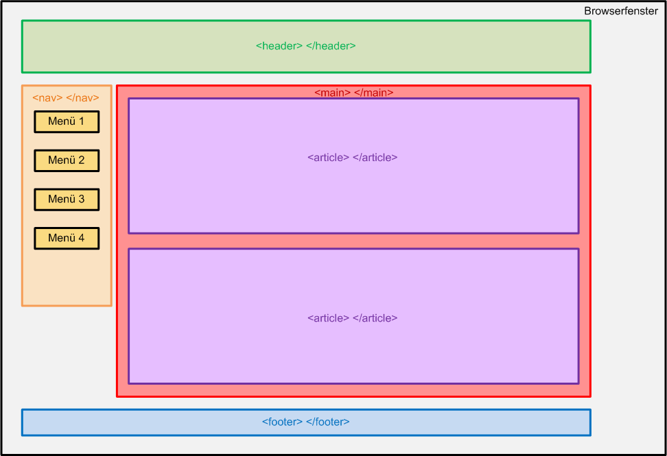 Bei der nächsten Website, die wir erstellen werden, versuchen wir, dieses 2-spaltige Seitenlayout umzusetzen. Dabei werden wir die diversen Bereiche mit den neuen semantischen HTML5-Bereichsnamen auszeichnen.